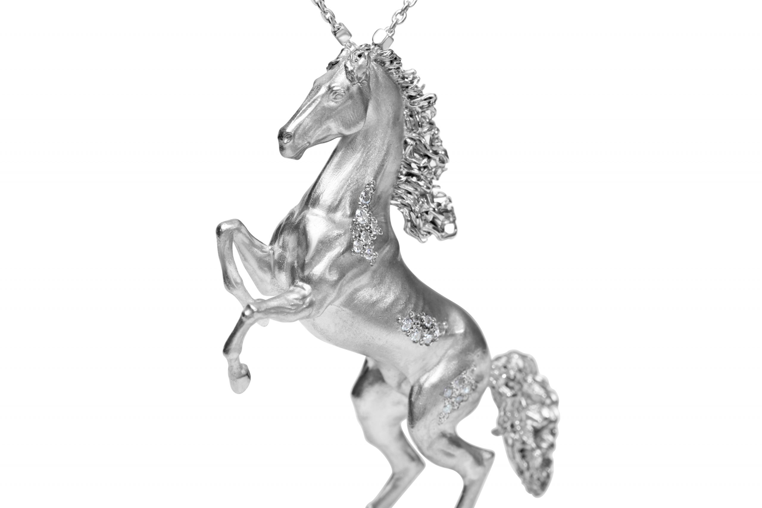 Colgante caballo con diamantes realizado en plata de ley 925. La pieza representa un caballo en movimiento ascendente, trabajado como una escultura portátil donde se enfatizan la tensión del cuerpo, la fuerza de las patas y la fluidez de la melena.